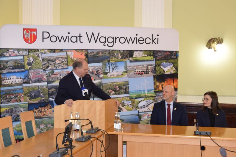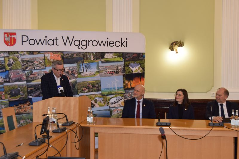 Wagę i znaczenie dla infrastruktury drogowej naszego powiatu podpisanych umów podkreślił w swoim wystąpieniu Starosta Wągrowiecki Tomasz Kranc. W spotkaniu, które poprowadził Dyrektor Gabinetu Wojewody Piotr Pałczyński, uczestniczyli również: Posłowie na Sejm RP Adam Luboński i Henryk Szopiński, Przewodnicząca Rady Powiatu Wągrowieckiego Natalia Pałczyńska, Wicestarosta Jerzy Springer, Członek Zarządu Powiatu Robert Woźniak, dyrektor Powiatowego Zarządu Dróg Agnieszka Suska oraz Sekretarz Powiatu Radosław Kubisz.